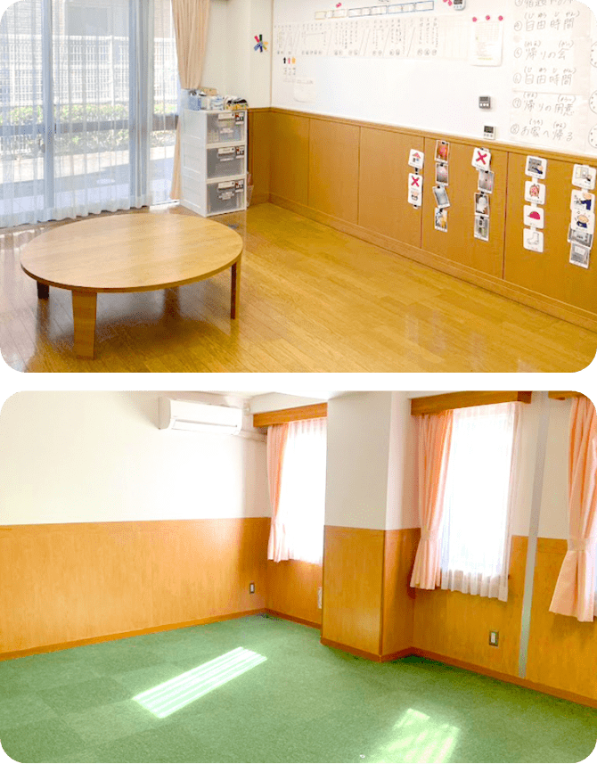 身体を動かす遊びや運動療育を行う部屋、ソーシャルスキルトレーニングなどの座って活動をする部屋、宿題やおやつを食べる部屋と、活動のシーンに合わせて部屋を分けて過ごしています。