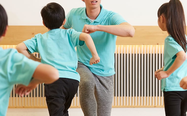 普段の外遊びの場では、鬼ごっこ遊びなどでルールの理解を促し、集団活動で遊ぶ楽しさを味わえるようにしています。休日には大きな遊具がある公園へ出掛け、のびのびと身体を動かすことで身体の発達や情緒の安定を促します。合同運動会に参加し、発達段階に合わせた練習も行います。- リズム体操