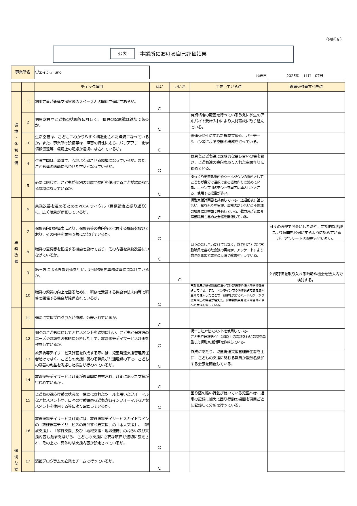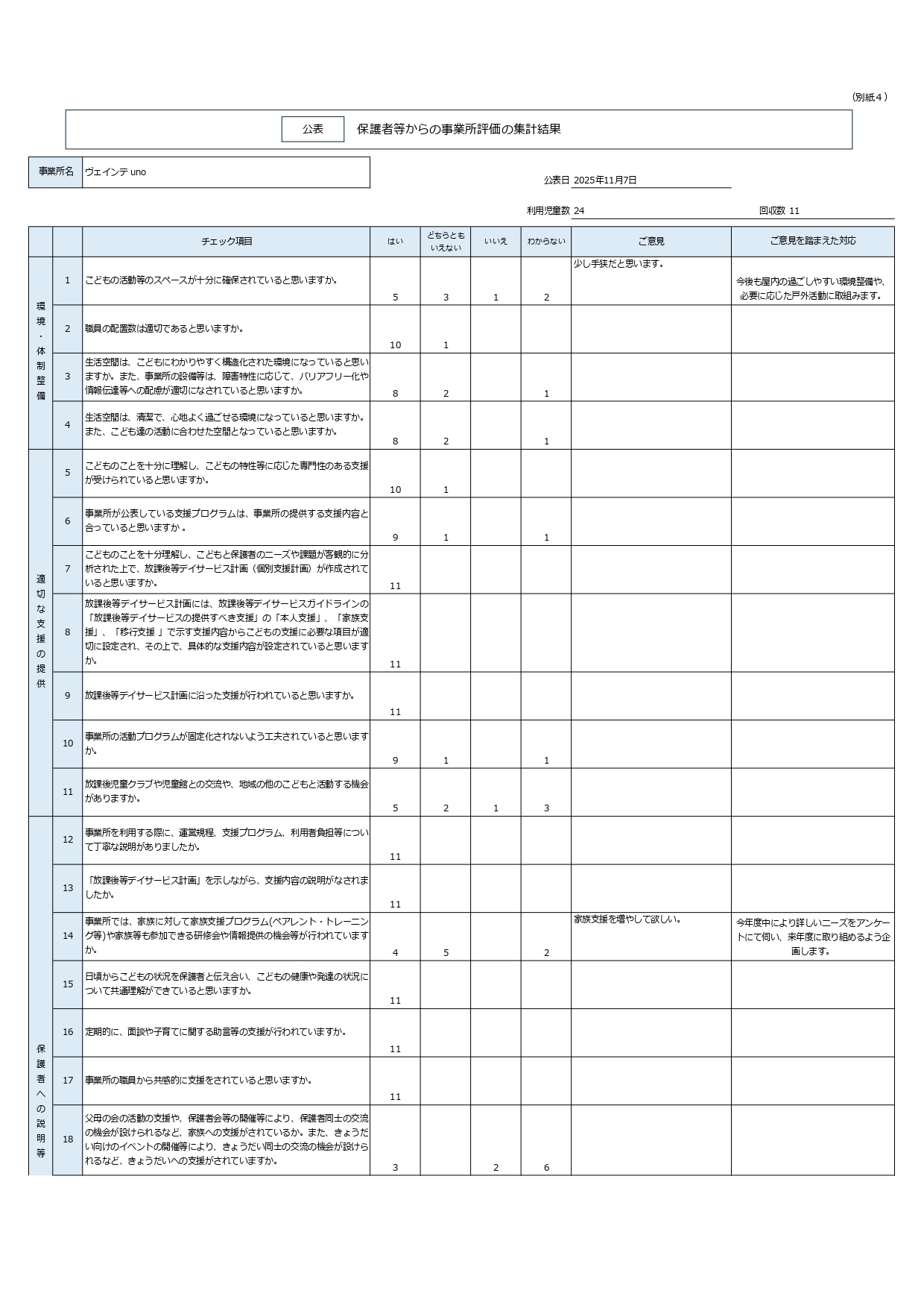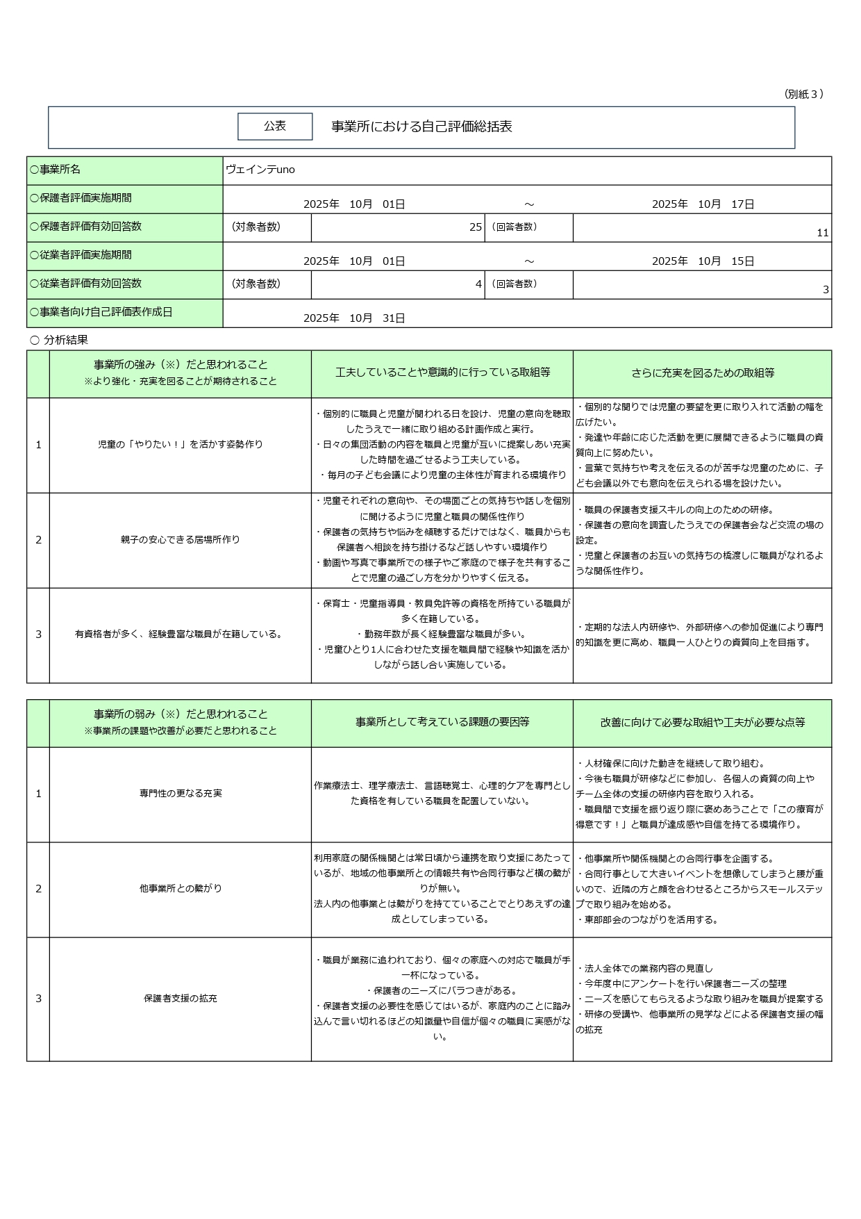 2025.11.07 情報公開 【ヴェインテuno】令和7年度 自己評価表・保護者評価表の公表について ヴェインテunoです。 令和7年度の保護者評価表と職員自己評価表を公表しました。 保護者の皆様、ご多用のところ沢山のご協力をありがとうございました。 Tweet